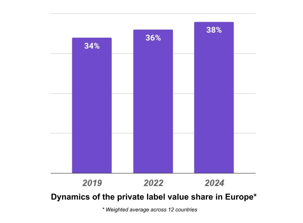 Os produtos de marca própria têm uma presença surpreendentemente forte na Europa, com uma participação média de mercado de quase 40%. Embora esse número varie significativamente entre países, está crescendo constantemente, com um aumento de 4 pontos percentuais desde 2019.